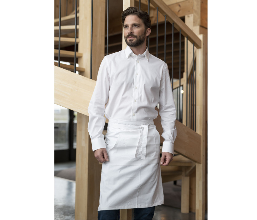 - Tablier barman mi-long. Hauteur : 58 cm. Largeur : 90 cm. Multipoches. Lavage 60°.