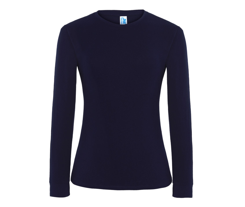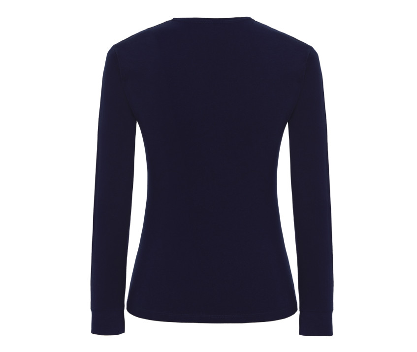 Tee-shirt femme manches longues à bord côte. Coupe tubulaire. Double surpiqûre au cou, épaules et taille. Col avec bord côte élasthanne. Bande de propreté au cou et épaules. Etiquette amovible.