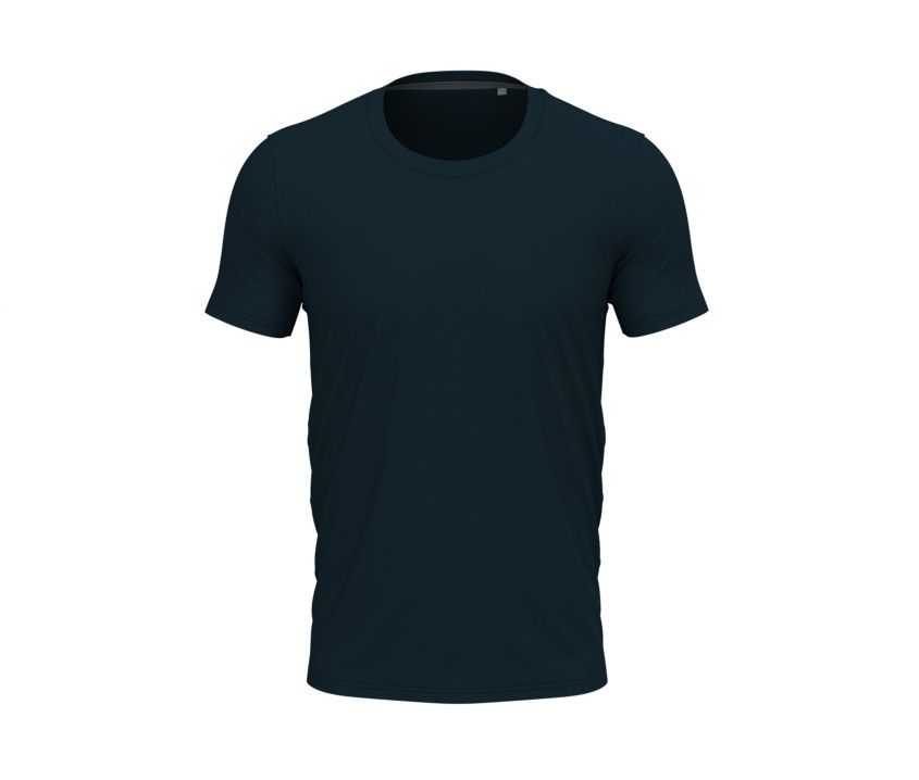 Tee-shirt près du corps. Bande de propreté contrastée. Coutures aux épaules renforcées. Col fin dans la même matière. Coutures latérales. Petite étiquette de taille dans le cou. Étiquette d’entretien dans la couture latérale.