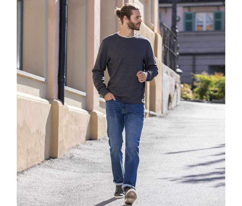 Coupe droite. Taille normale. Fermeture par bouton et braguette zippée. Passants pour ceinture. 5 poches. Denim délavé.