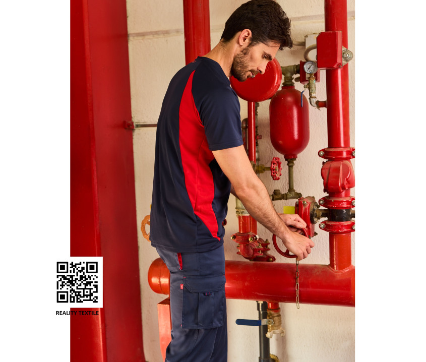 Fermeture centrale à glissière et bouton. Contraste de couleurs sur les rabats, les curseurs et les coutures. Taille élastiquée. Double couture de sécurité. Six poches : 2 poches françaises, 2 poches avec fermeture à double rabat central, velcro et curseurs, 2 poches arrières avec fermeture à rabat, velcro et curseurs. EMET, c'est une abréviation pour élasto multi ester, il s’agit d’une matière polyester élastique, moins élastique que l’élasthanne, plus durable et résistante à la javel.