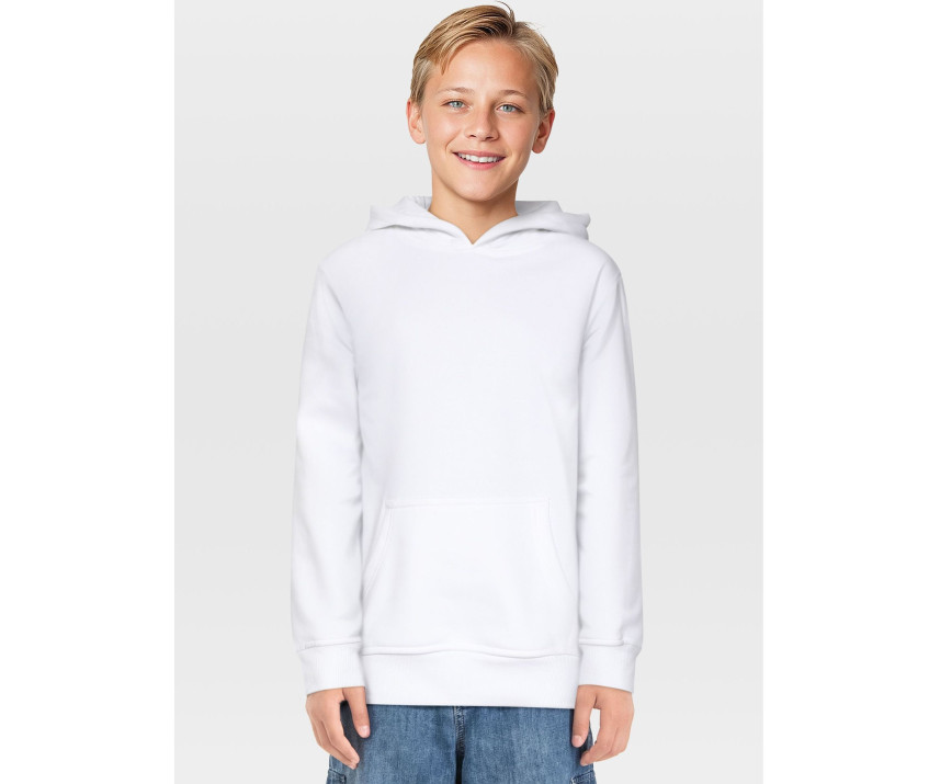 Puce de taille au col. Bande de propreté au col. Bord côte aux manches et à la taille. Poche kangourou. Capuche sans cordon. Manches droites.