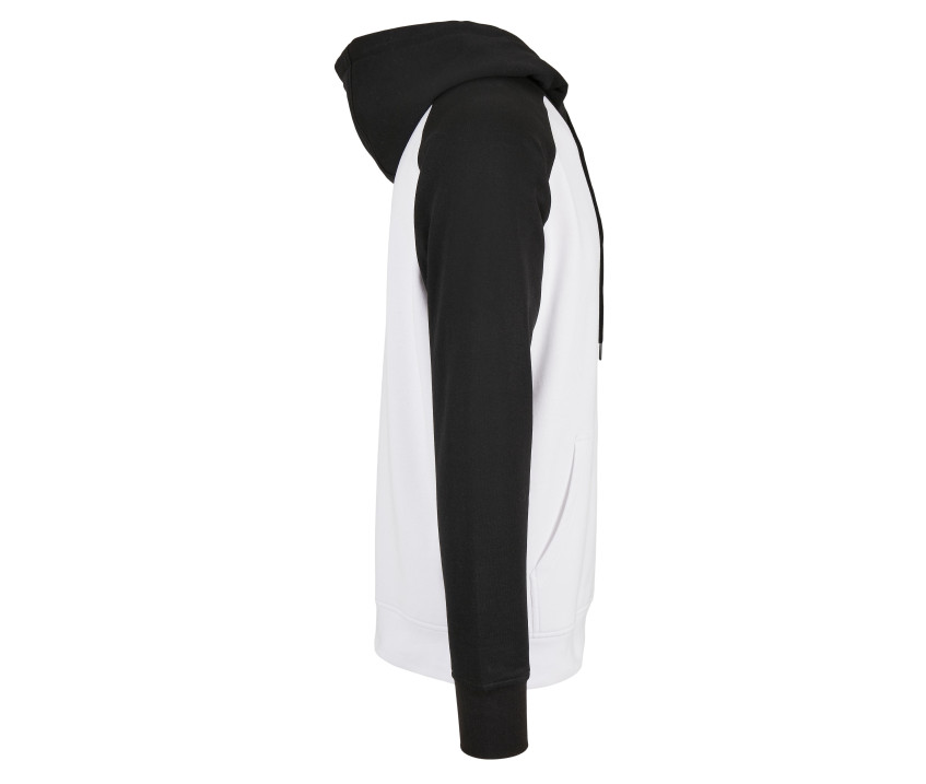 Manches raglan. Intérieur gratté. Capuche et manches contrastées. Capuche ajustable. Poche kangourou. Puce de taille au col.