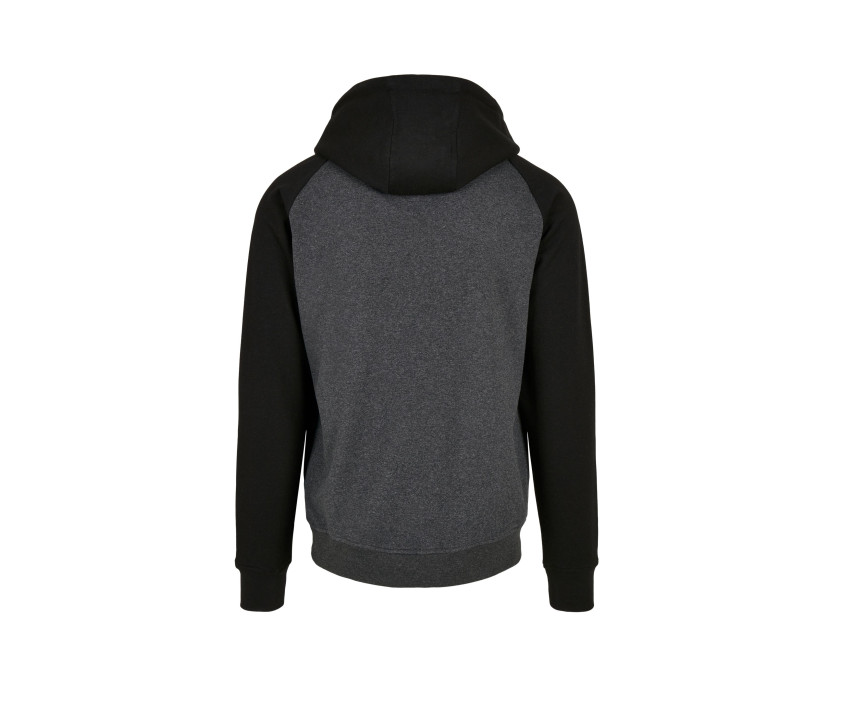 Manches raglan. Intérieur gratté. Capuche et manches contrastées. Capuche ajustable. Poche kangourou. Puce de taille au col.