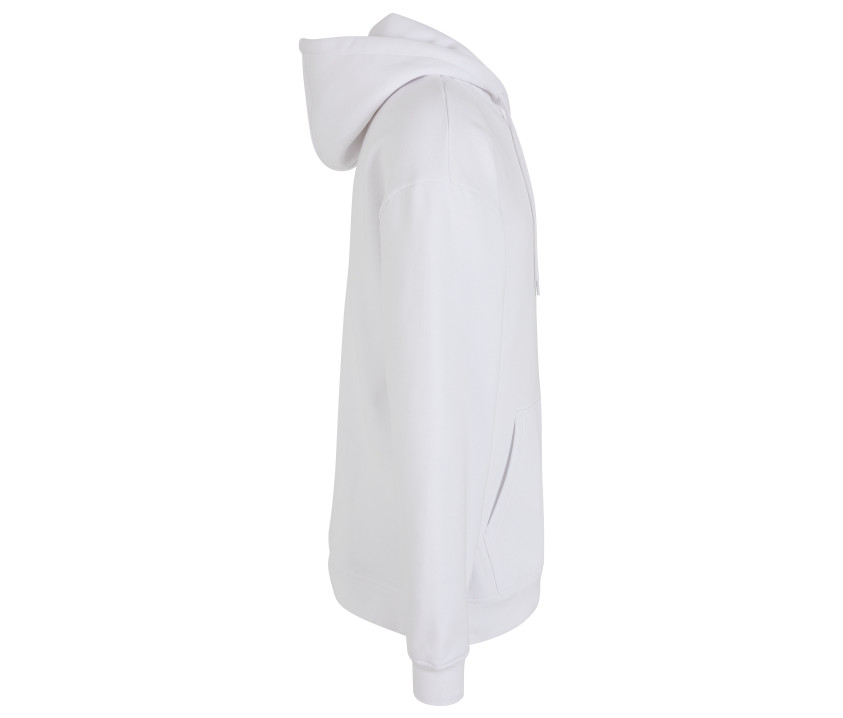 Coupe très ample. Manches droites. Capuche ajustable par cordons. Poche kangourou. Bord côte épais aux poignets et à la taille. Puce de taille au col.