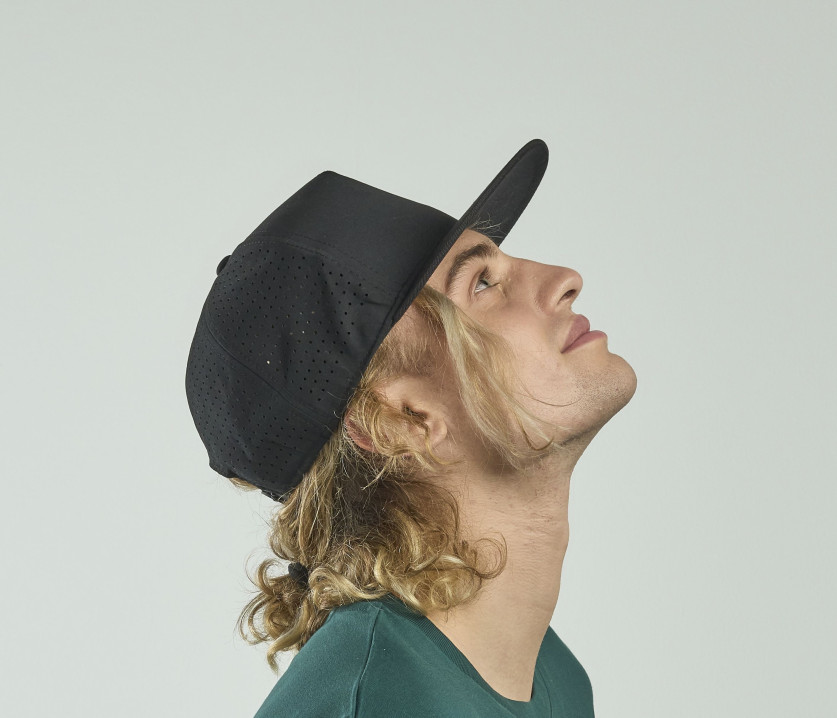 5 panneaux. Visière plate. Panneaux avant renforcés. Fermeture par patte. 4 coutures sur la visière. Trous fin réalisés au laser sur les côtés. Tour de tête : 58cm. Structure de la visière en plastique.