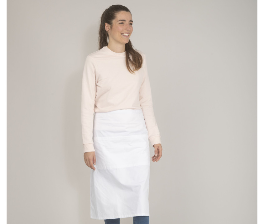 Tablier barman long, 3 poches. Hauteur 62cm - Largeur 90cm. Lavage 60° (étiquette 30° erronée). Longueur de chaque lien pour nouer le tablier : 75cm.