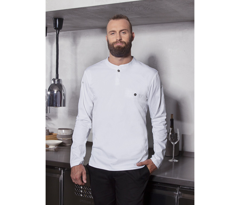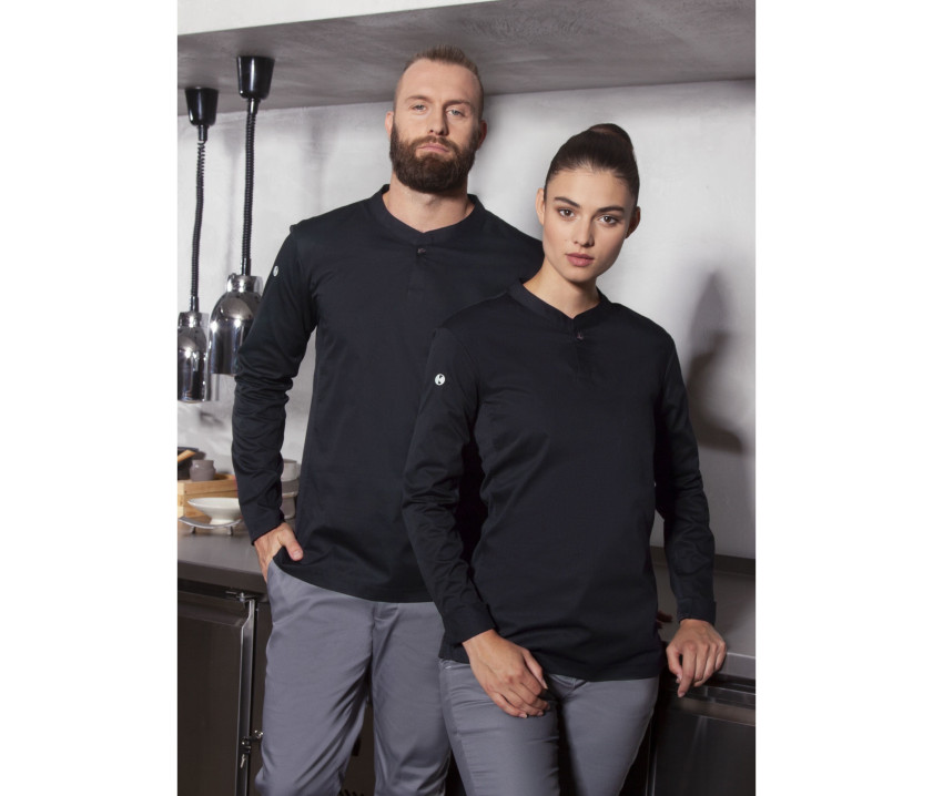 Tee-shirt de travail manches longues au look sportif et élégant. Coupe cintrée. Convient aux domaines suivants : cuisine, service, nettoyage, soins, bien-être... Dos en jersey piqué. Haute résistance au lavage contre les tâches tenaces. Col montant étroit et petite bande de boutons. Poche passepoilée sur la poitrine avec bouton. Poche passepoilée sur la manche gauche.