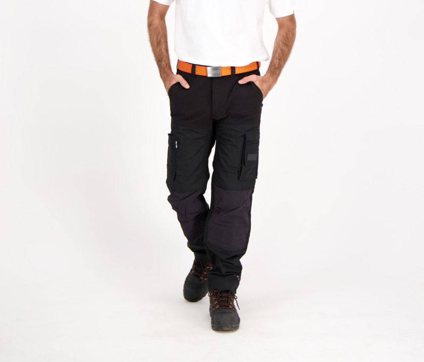 Pantalon multi-poches avec des parties extensibles dans les 4 sens à l'entrejambe et sur les côtés pour plus de mobilité et de confort. Canvas extensible avec technologie Coolmax, fonctions de séchage rapide et d'évacuation de l'humidité. Bouton recouvert. 2 poches latérales. 1 poche GSM. 2 poches sur les cuisses avec poches sur les jambes. 1 poche pour le mètre. 2 poches arrière. Genoux préformés. 1 boucle pour le marteau. Ourlet à rallonge.