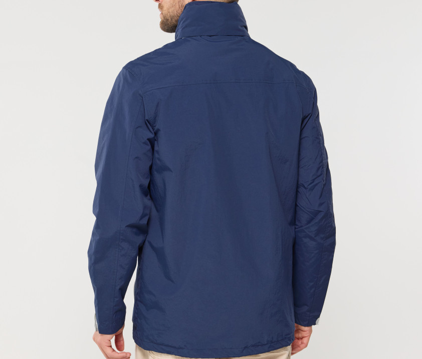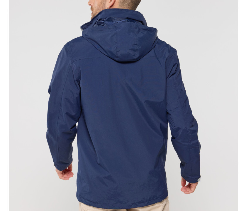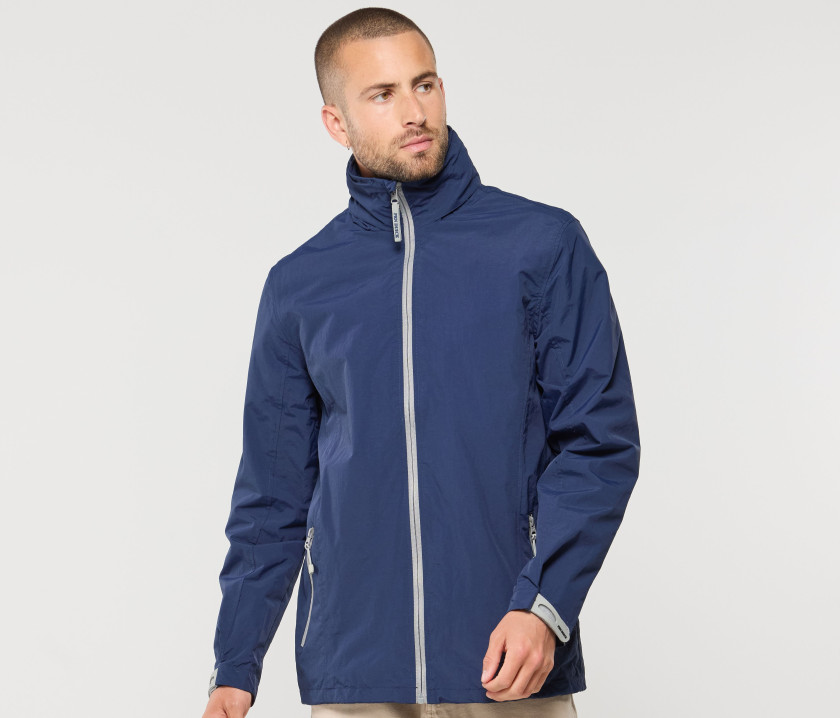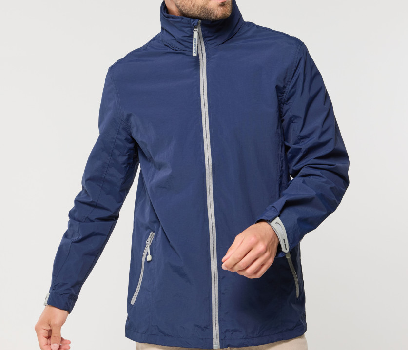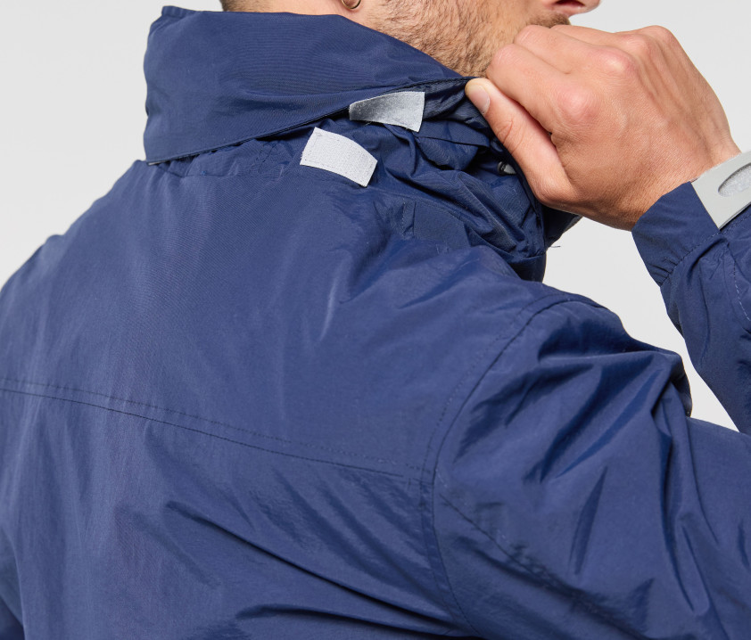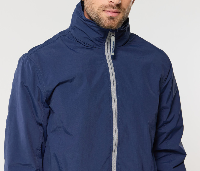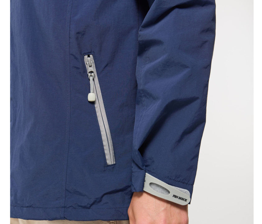 Capuche dans le col avec cordons contrastés. 2 poches zippées latérales. Cordon ajustable à la taille. Fermetures Éclair® contrastées. Languette Pen Duick détachable sur fermeture Éclair® principale. Accès pour marquage. Poignets ajustables par languette.
