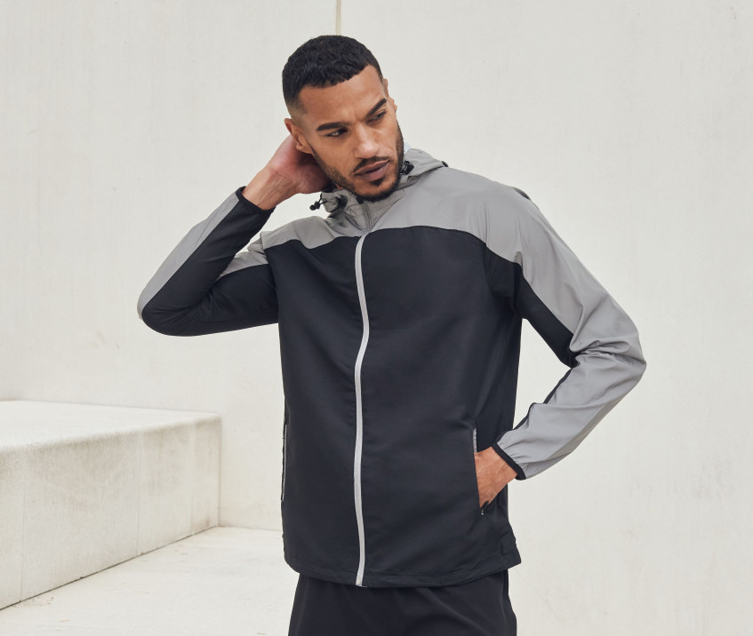 Coupe-vent, imperméable et respirant. Réflechissant sur la poitrine/les manches. Capuche 3 pièces avec cordon de serrage et stoppeurs réglables. Étiquette détachable. 2 poches zippées.