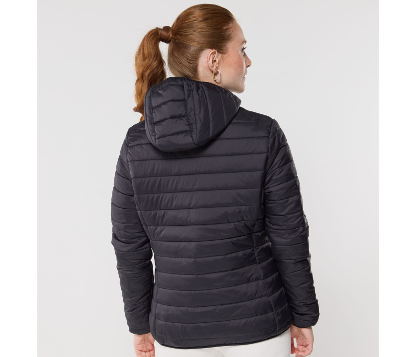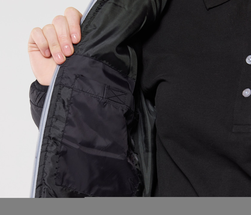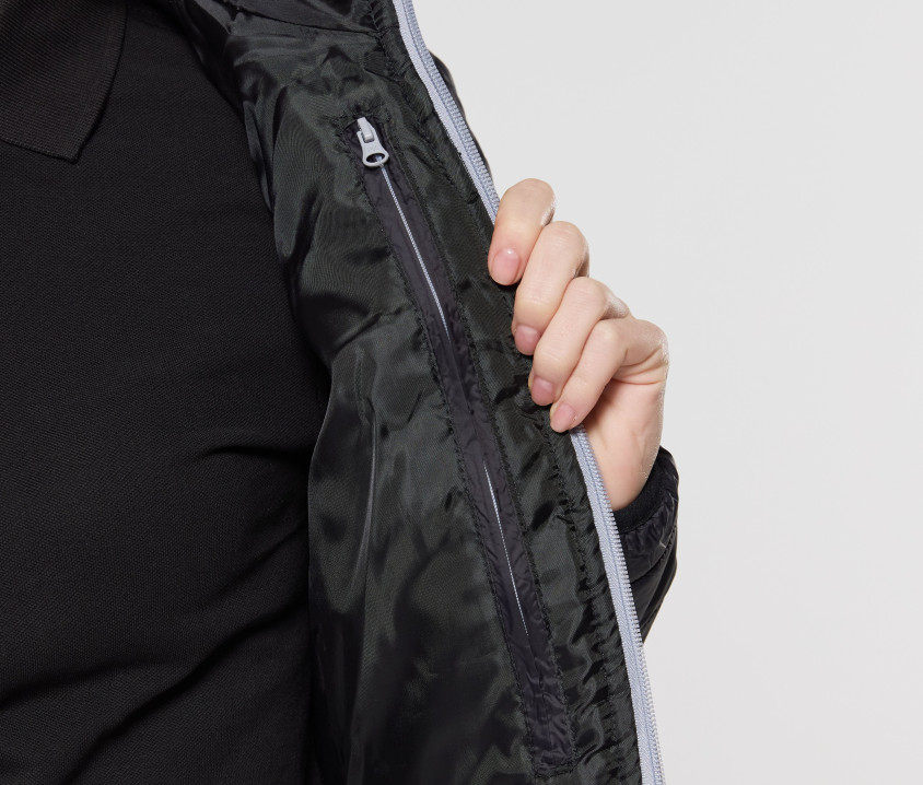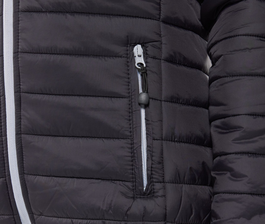 Doudoune avec capuche. Coupe-vent et déperlant. 2 poches latérales avec languette. Grande poche intérieure zippée. Poche intérieure Velcro®. Poignets et ourlet élastiqués. Hauteur entre les coutures : 4cm.