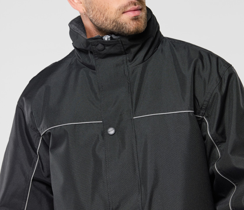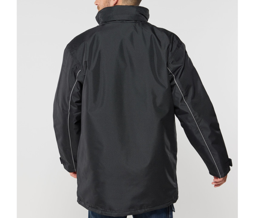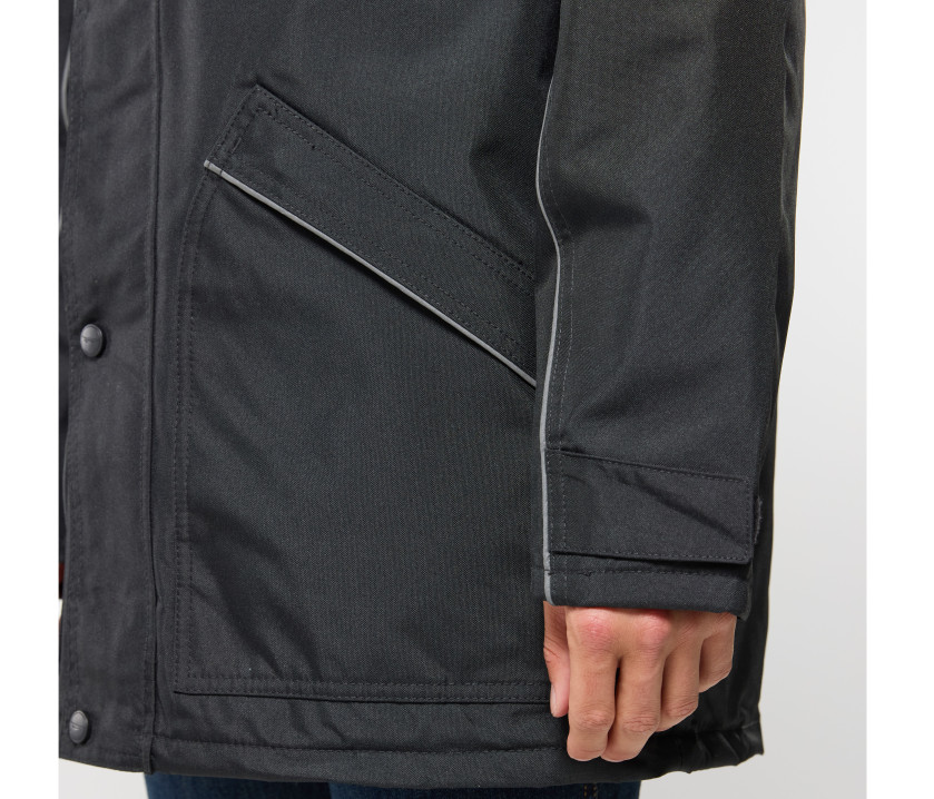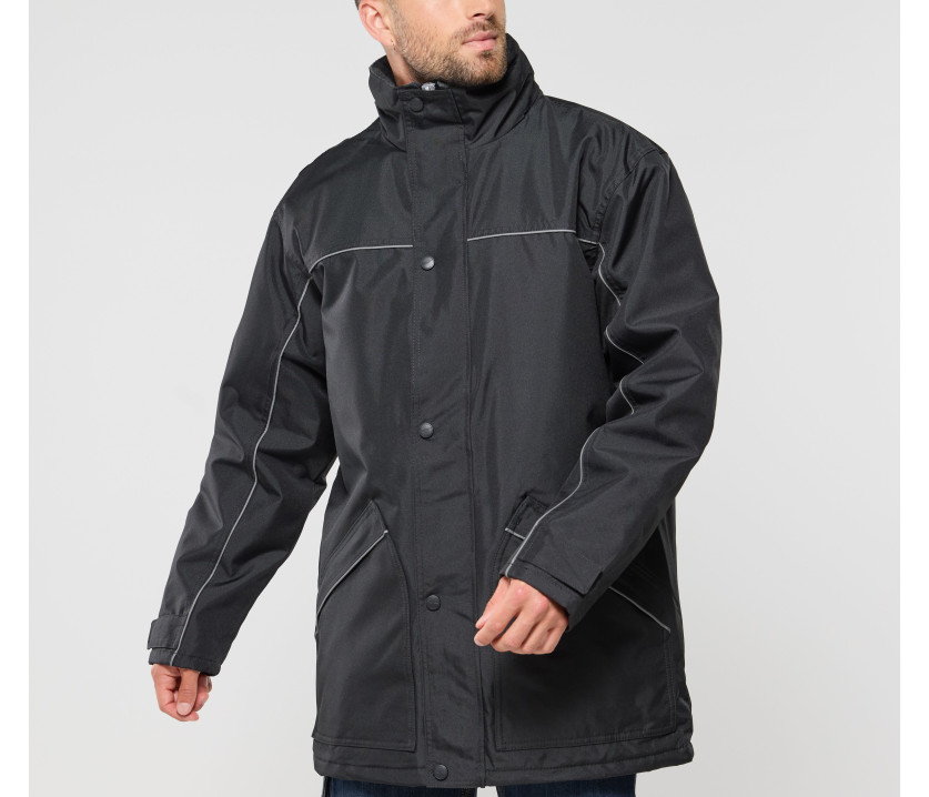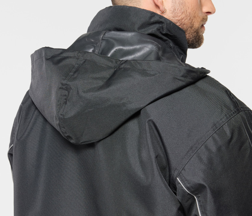 Coupe-vent avec enduction imperméable. 2 poches extérieures zippées. 2 poches intérieures. Capuche en Oxford dans le col. Col doublé polaire. Patte auto-agrippante aux manches. Accès pour personnalisation. Passepoil réfléchissant aux manches, devant et poches.