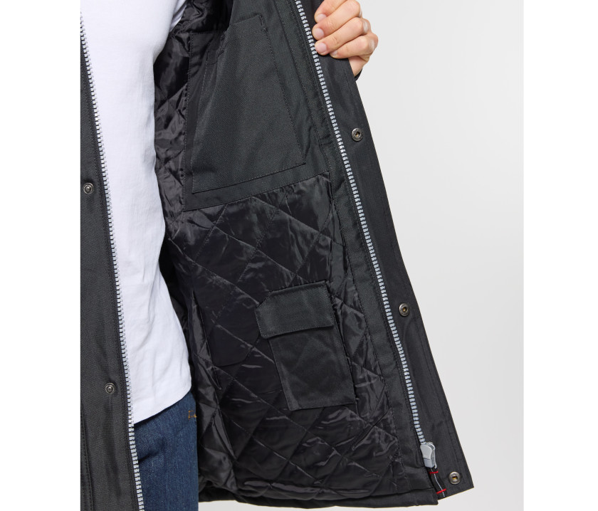 - Coupe-vent avec enduction imperméable. 2 poches extérieures zippées. Capuche en Oxford dans le col.