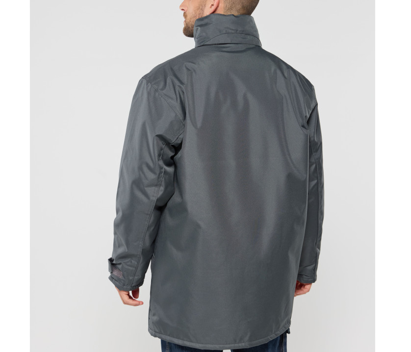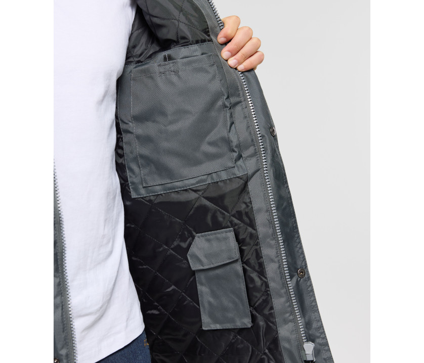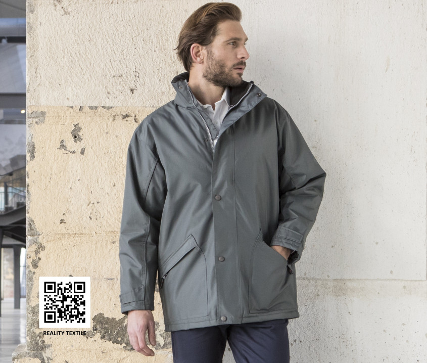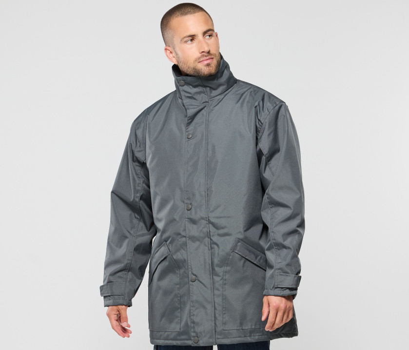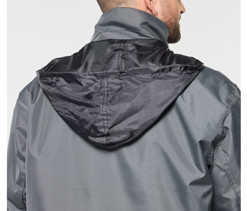 - Coupe-vent avec enduction imperméable 1000mm. 2 poches extérieures zippées et 2 poches intérieures (portefeuille et GSM). Capuche dans le col.