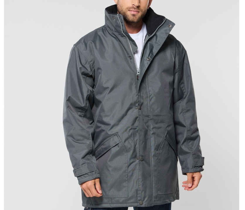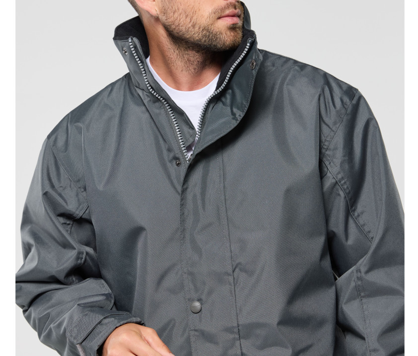 Coupe-vent avec enduction imperméable 1000mm. Col doublé polaire. Velcro® aux manches. 2 poches extérieures zippées. 2 poches intérieures (portefeuille et GSM). Capuche dans le col. Accès pour personnalisation (cœur et dos).