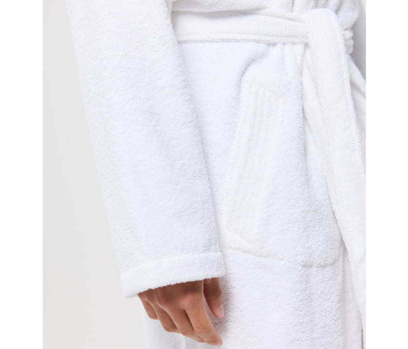 Peignoir de bain avec capuche. Bande de propreté en velours. 2 poches. Ceinture.