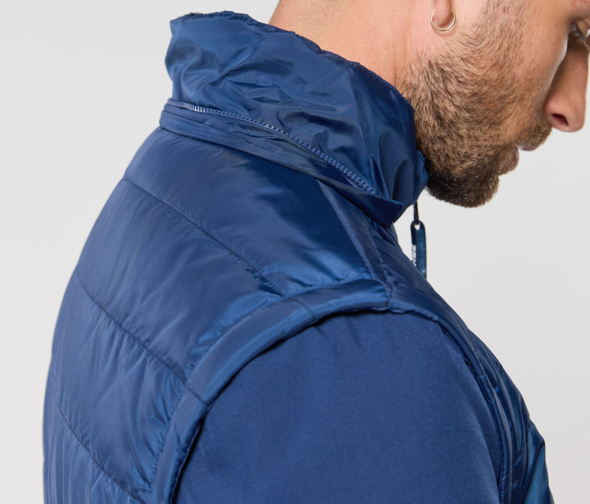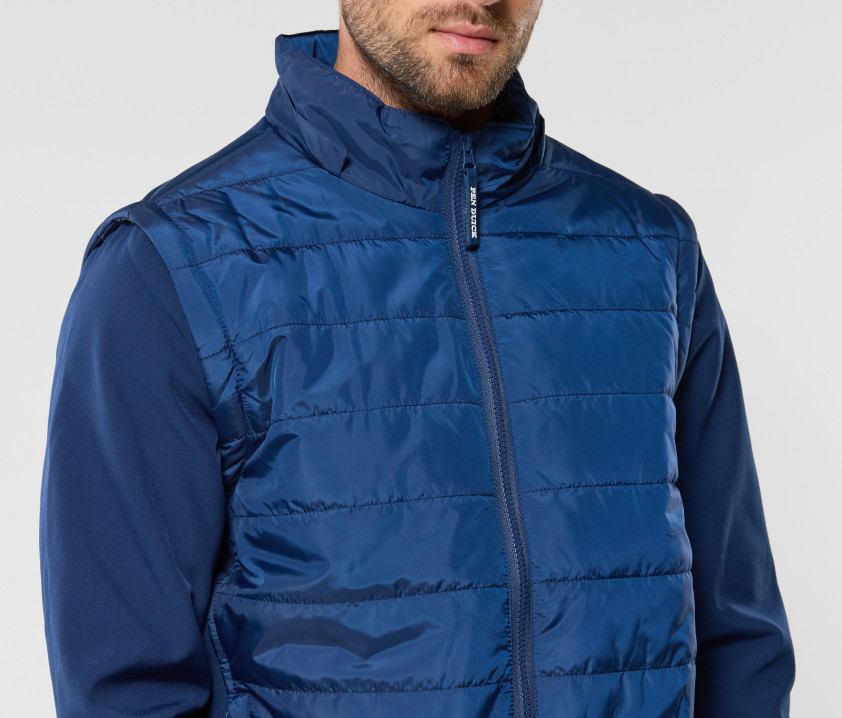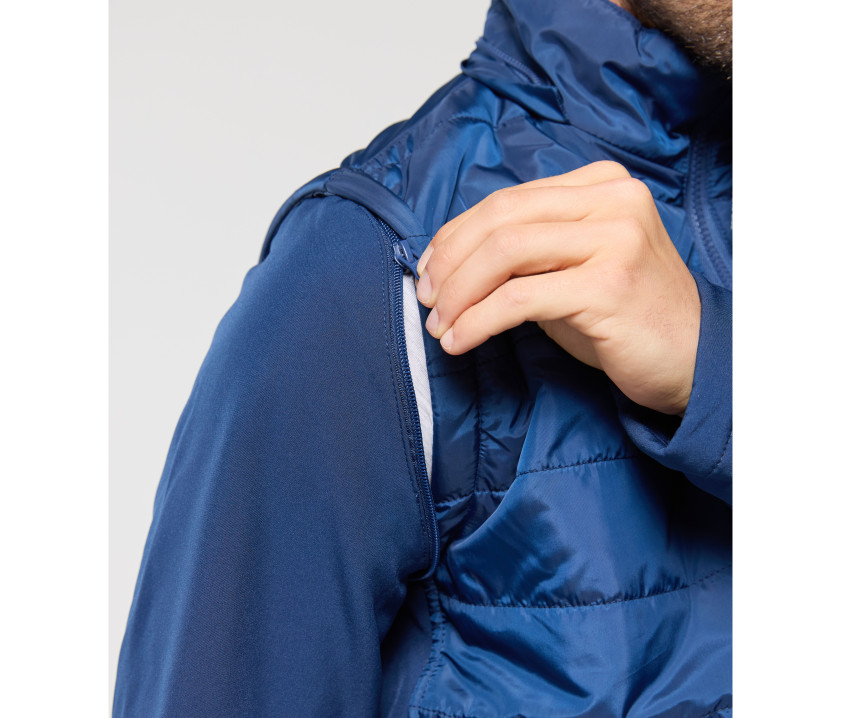 - Veste matelassée aux manches amovibles. Combinaison de 2 matières : corps matelassé, manches et côtés en Softshell. Possibilité d'ajouter les capuches Réf. PK995, Réf. PK996, Réf. PK997.