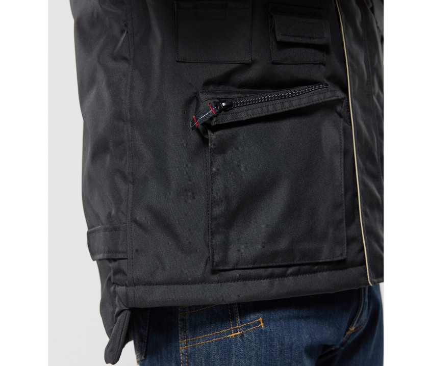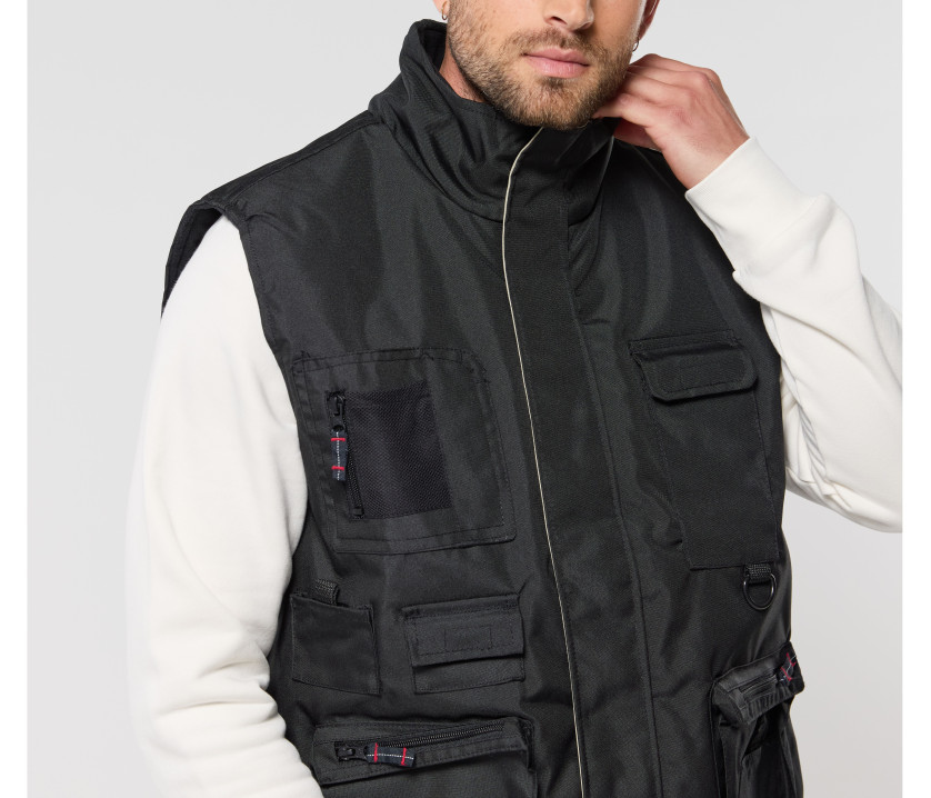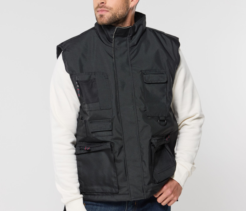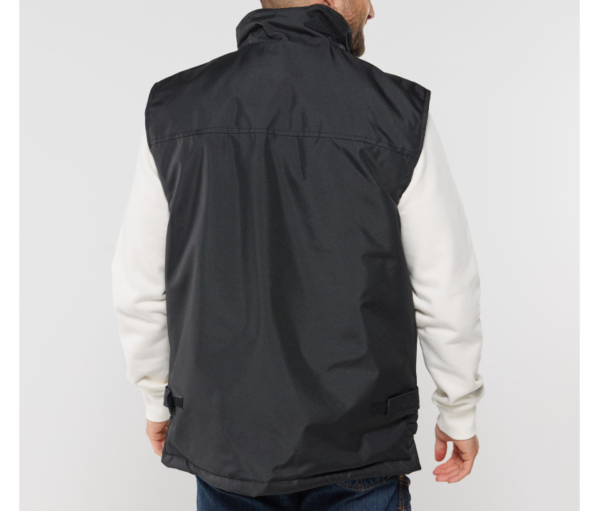 - Bodywarmer coupe-vent multi-poches avec enduction imperméable. 10 poches extérieures. Dos plus long et Velcro® pour ajustement de la taille.