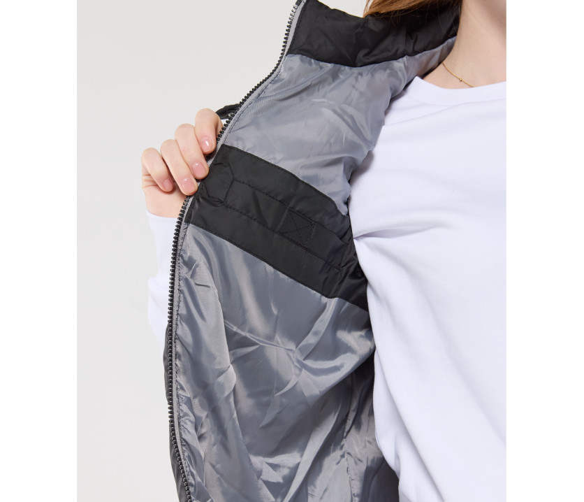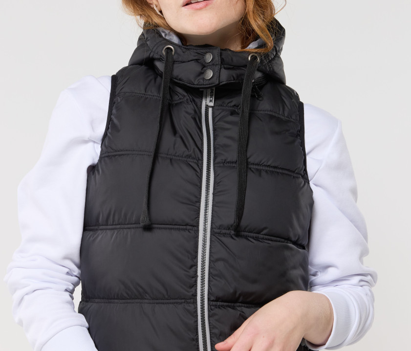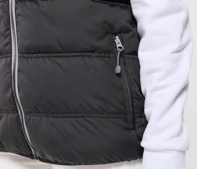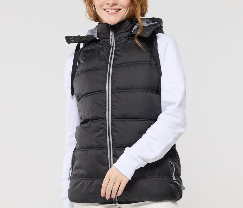 Bodywarmer femme matelassé. Fermeture zippée contrastée avec tirette logotée Pen Duick. Doublure et fermetures Éclair® des poches contrastées. Capuche détachable et ajustable par cordon plat. Déperlant et coupe-vent. 2 poches intérieures dont 1 zippée. Coupe ajustée.