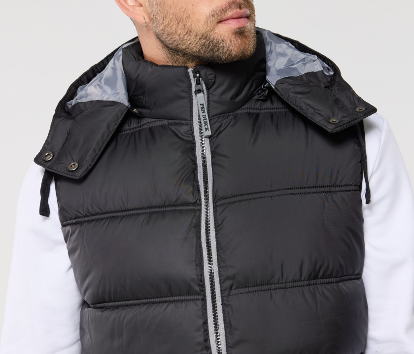 Bodywarmer homme matelassé. Fermeture zippée contrastée avec tirette logotée Pen Duick. Doublure contrastée. Fermetures Éclair® des poches contrastées. Capuche détachable et ajustable par cordon plat. Déperlant et coupe-vent. 2 poches intérieures dont 1 zippée. Coupe ajustée.