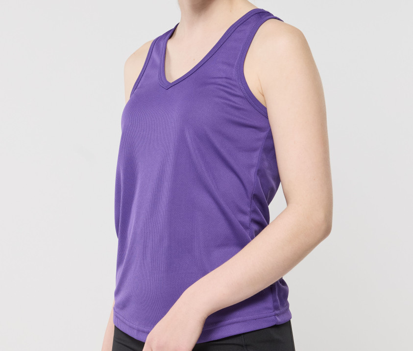 Débardeur de sport femme. Étiquette imprimée pour plus de confort. Coupe ajustée. Léger et respirant. Col et emmanchures de la même matière que le débardeur. Disponible en 9 couleurs. Dos nageur.