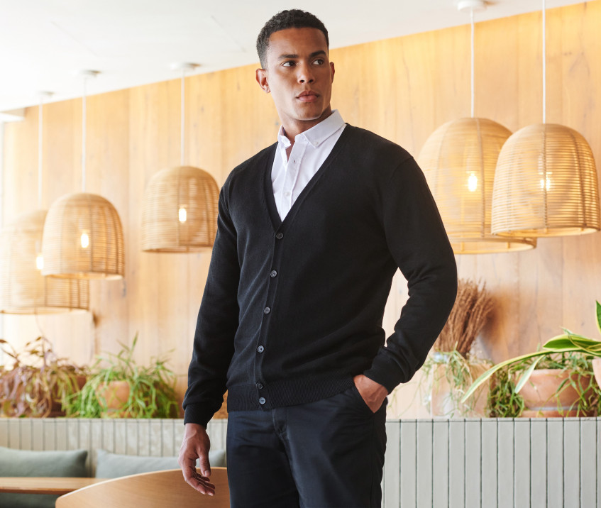 Jauge 12. Ourlet et poignets en bords côte. Boutons corne ton sur ton.