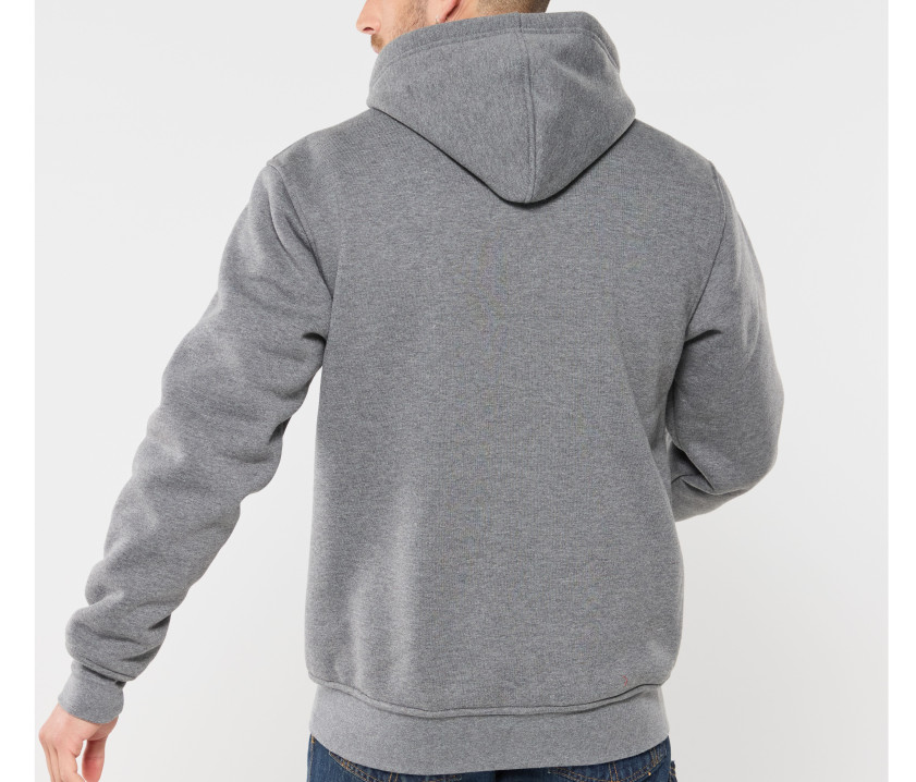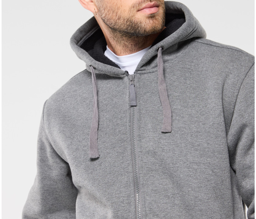 Sweat capuche full zip. Intérieur polaire Sherpa 550 g/m². 2 poches latérales zippées. Cordon plat de serrage. Véritable veste à capuche.
