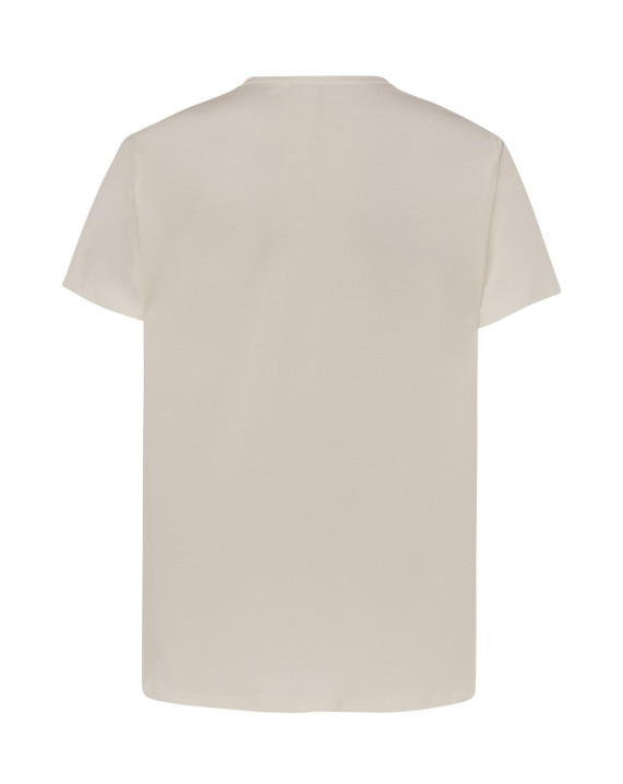 Coupe tubulaire. Double surpiqûre au cou, épaules et taille. Col en bord côte avec élasthanne. Bande de propreté au col et épaules. Coloris Prepared For Dye (Prêt à teindre) : Mensurations décalées d'une taille par rapport à la teinture.