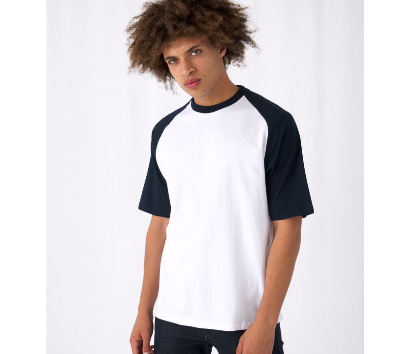Coupe tubulaire. Col coton/élasthanne. Manches raglan contrastées.